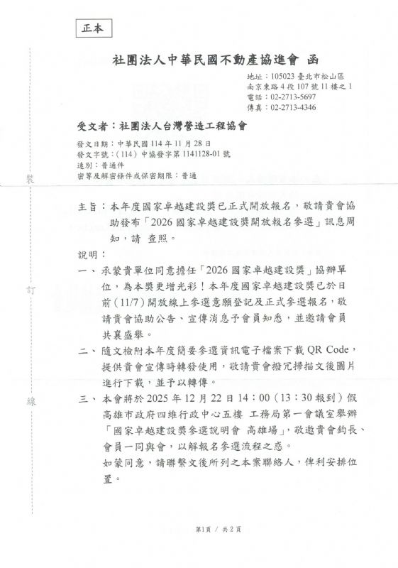有關社團法人中華民國不動產協進會主辦「2026國家卓越建設獎」,本會擔任協辦單位,即日起主辦單位受理報名至115年2月26日截止收件,敬請 踴躍報名參加。